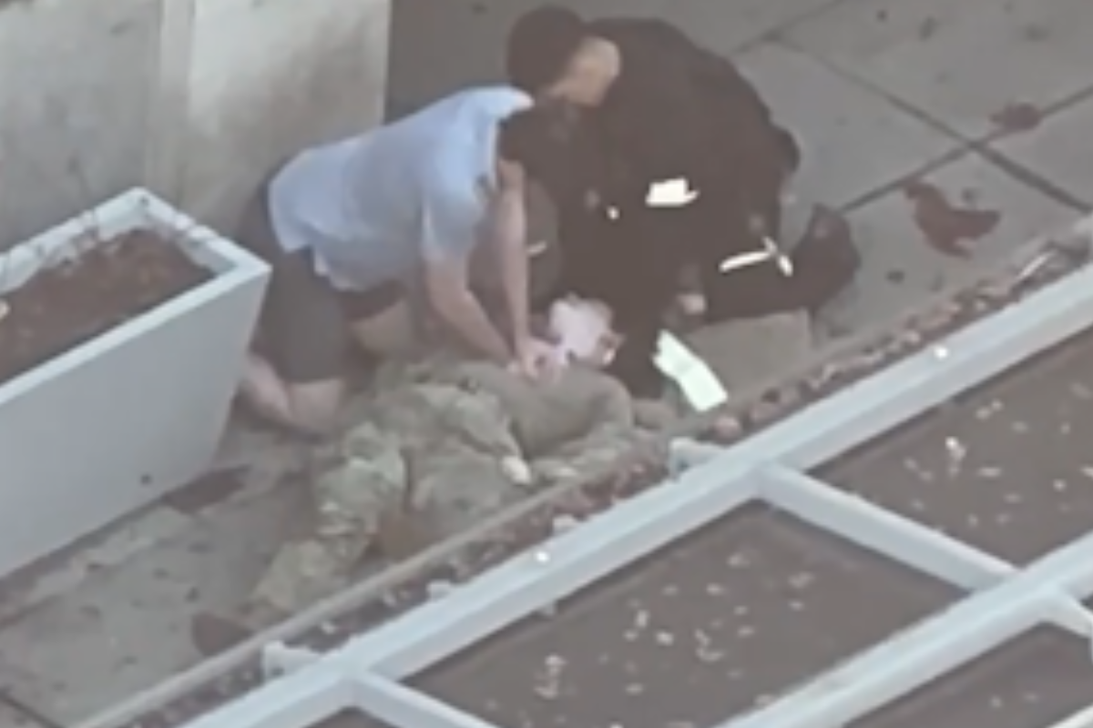 En la grabación se observa a paramédicos asistiendo rápidamente a los guardias heridos mientras un tercer hombre es retenido en la escena.